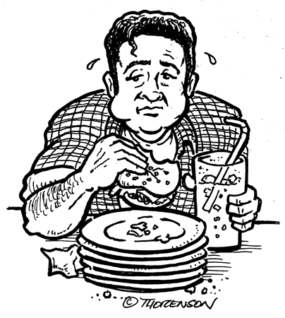 About a year ago, after a decade of satellite service, we allowed cable television into our lives. Not surprising is that a number of programs we watch now are on channels we never got before. Our remote frequently stops at the Food Channel (aka food porn) and, believe it or not, the Travel Channel. One program in particular, ‘Man v. Food’, we find especially engrossing. In it, host Adam Richman takes on any number of eating challenges at famous eateries across the nation. I’m not sure what his fight record is, but it seems whenever I tune in he’s getting walloped by overindulging in something too spicy, too starchy or just plain impossible to finish in the time allotted.