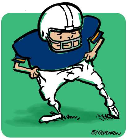 My oldest son just started his second year of midget football and has been struggling through practices. Not so much because he is out of shape but because his pants don’t fit. Running wind sprints is difficult when your pants slide down to fit more like a gunny sack in a potato race. We determined that the problem isn’t the size of the pants, but the fact that the ‘belt’ really isn’t a belt because it doesn’t loop through the pants around the waist. Instead the two ends, each about six inches long, are sewn to the front. Essentially the best he can do is cinch his pants. Poor kid. He’s usually too big for his britches. I think we’ll be cocooning his trousers up with athletic tape tonight.