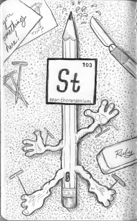 This sketch is loosely based on my memories of Biology and Chemistry. I actually didn’t mind dissecting dead critters (‘Mickey’ Rat included) but really hated that Formaldehyde smell. Chemistry was a completely different story. I had very little passion for balancing molecular equations and memorizing how many available electrons existed in the outer orbit of an element’s atom. Ionic compounds be damned! I don’t know how many elements there are in the Periodic Table anymore but 103 seemed like an unused number. If not, ‘St’ could stand for ‘Stupidium’.